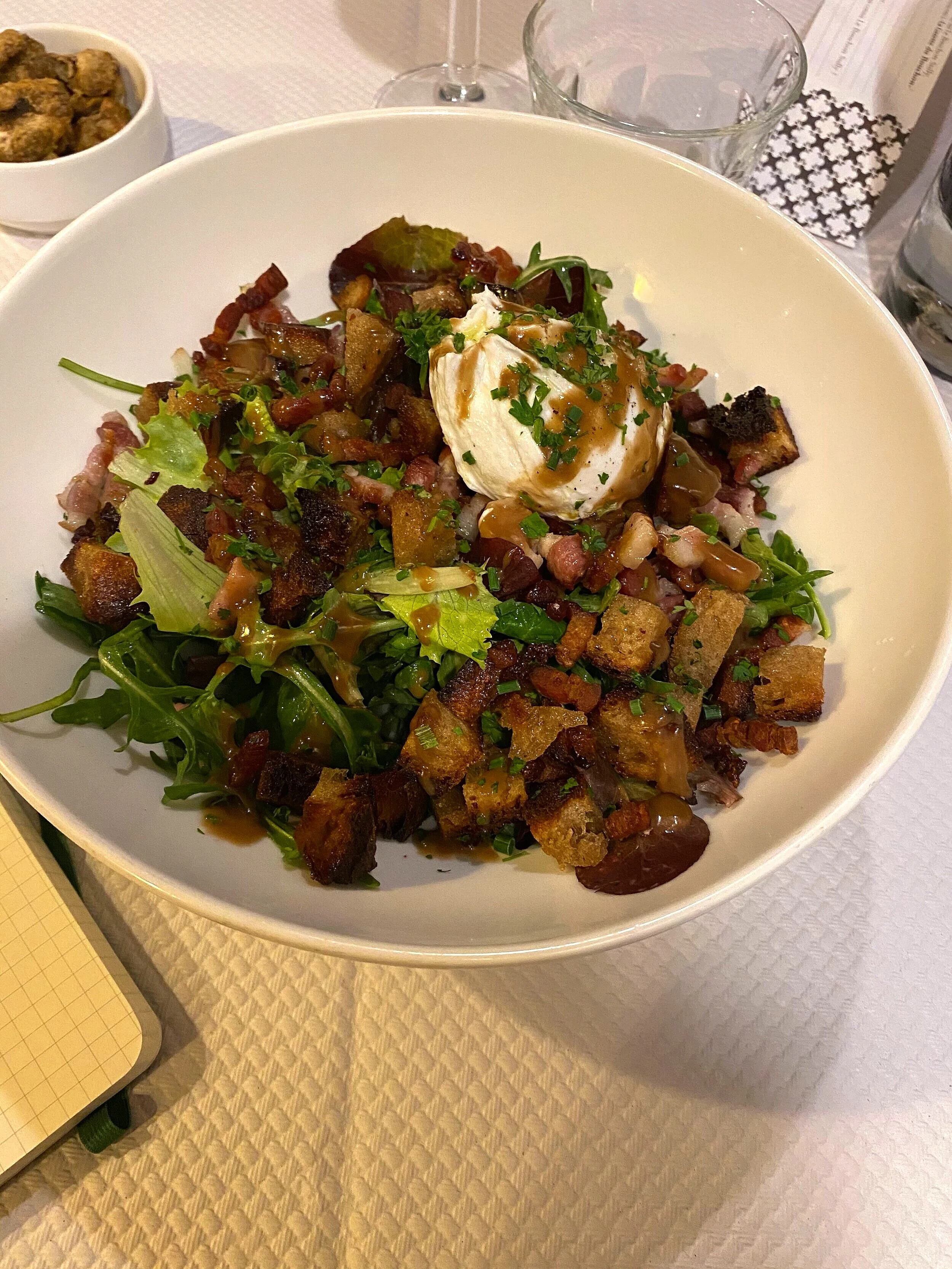 Lyonnaise salad (frisée lettuce topped with a poached egg, thick bacon and a warm vinaigrette dressing)
